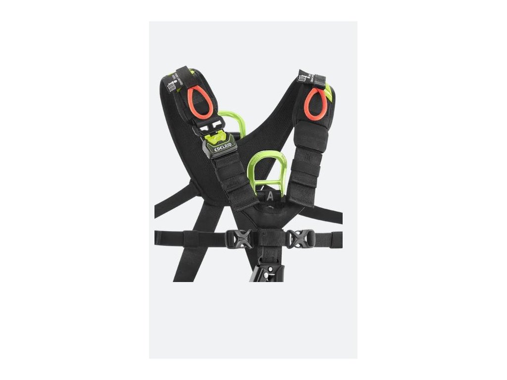 Celotělový pracovní postroj s přezkami Triple-Lock, které zvyšují bezpečnost při práci ve výškách. Celotělový postroj Edelrid Vertic Triple Lock je v pase vybaven sponou Cobra, díky které je možné obléci postroj ze strany. Ramenní polstrování a primární popruhy zajišťují rovnoměrné rozložení tlaku na povrch těla a zvyšují tak komfort postroje. Zádová část poskytuje tělu skvělou oporu. Postroj má čtyři pevné smyčky až pro 12 karabin (zatížení do 25kg). Dva velké hliníkové D-kroužky jsou určeny pro bezproblémové zaujmutí pracovní nebo pohotovostní polohy. Dvě střední oka jsou určena pro připevnění pracovní sedačky. Dostupný ve dvou velikostech.