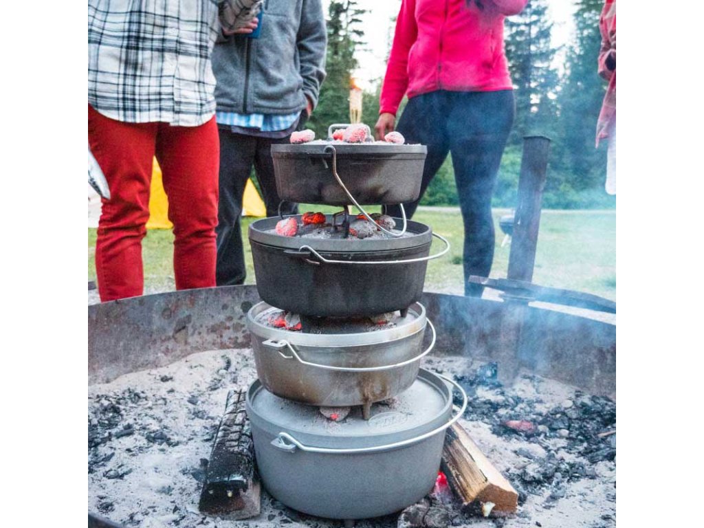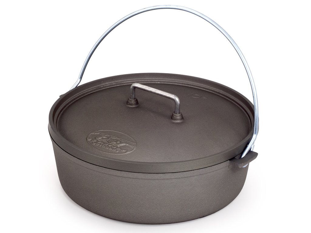 Ultra odolná hliníková holandská trouba do ohně s dokonalým rozvodem tepla. Tvrdě eloxovaná konstrukce kotlíku váží o celých 66% méně než litina, je velmi odolná proti poškrábání. Poklice má hlubší zapuštění, aby na ní snadno držely žhavé uhlíky. Holandské trouby od GSI Outdoors jsou navrženy tak aby 10" pohodlně zapadla do 12". Holandskou troubu je možné zapustit do žhavých uhlíků nebo jí lze použít jako zavěšený kotlík nad oheň.