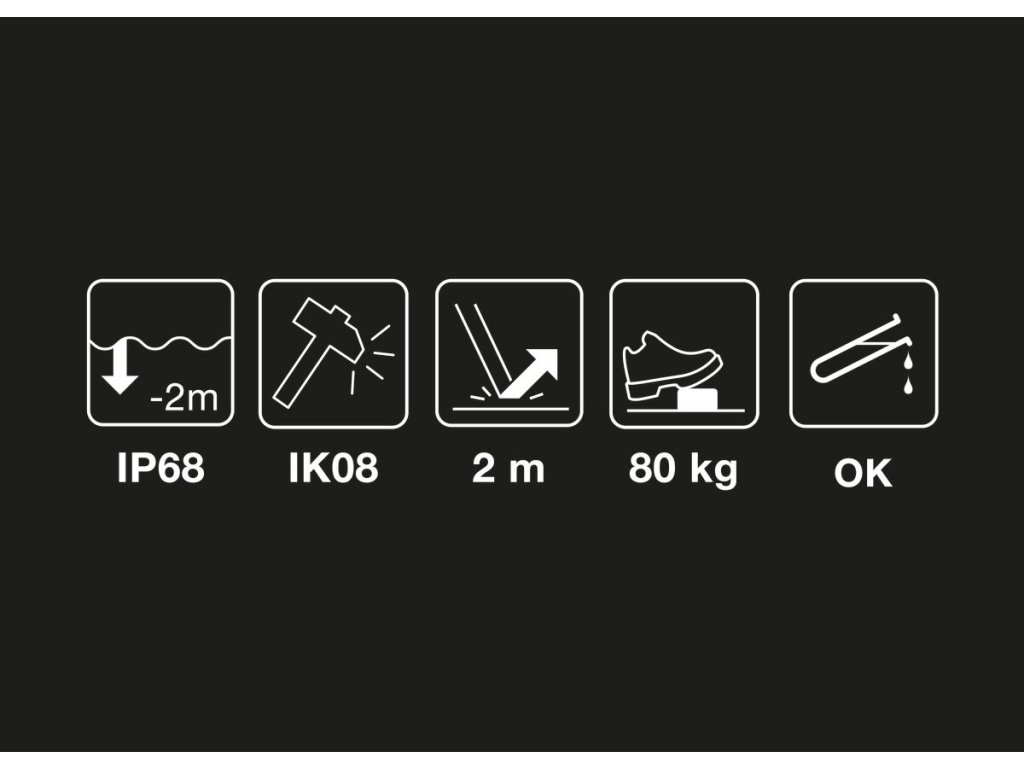 - Odolná svítilna je nárazuvzdorná (IK08), odolná proti pádu (až ze 2 metrů) a odolná proti rozdrcení (až do 80 kg)