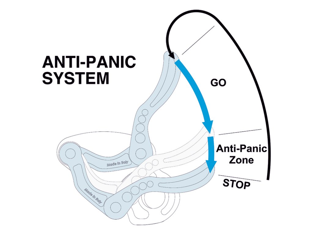 Anti-panic systém u jistítka Matik slouží k bezpečnému spouštění lezce nebo samotnému slanění po jednom prameni. Celý systém je ovládán páčkou na levé straně jistítka. Páčka působí na otočnou vačku, kterou reguluje prokluz lana při spouštění. Anti-panic systém je pak moment, kdy je síla působící na vačku příliš velká - rychlé škubnutí lana, pád,.. - v tomto momentě páčka přecvakne a přestane na vačku působit. Vačka se zatáhne a zaškrtí lano. Anti-panic je pak možné znovu aktivovat posunutím páčky do horní pozice a zpět.