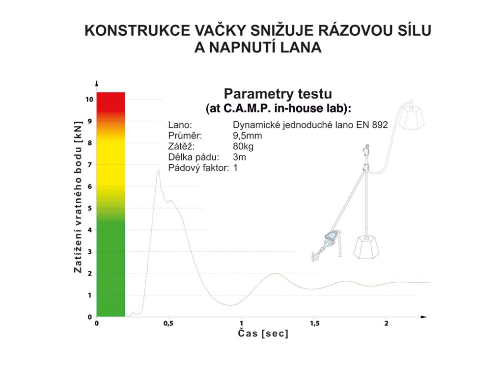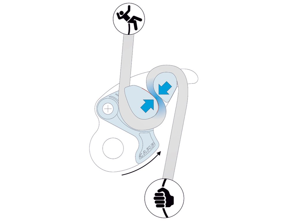 Při zachycení pádu se vačka stáhne, avšak umožní lanu dynamický prokluz - tedy lano okamžitě nezasekne v místě, ale nechá cca 30cm lana projet postupným stažením. Tím se výrazně šetří lano při více pádech do stejného místa a zároveň snižuje rázovou sílu pádu lezce.